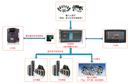 制杯机取杯机械手组装机需要控制2个伺服电机和1个变频器以及多个气缸。所以采用1台FBs-40MCT2-AC(主机)作为整台设备的控制系统;并使用1个FBs-B2DA(模拟量板)进行PLC对变频器的频率控制;上位机采用HMI触摸屏界面用于数据监控及参数设置。运动控制采用用伺服驱动及电机和变频器及电机;其它执行单元选用气缸,普通电机等;检测单元选用编码器和接近开关。整套配置方案能够帮助客户节约很多系统成本。整套配置方案能够帮助客户节约很多系统成本。