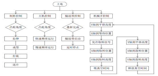 制杯机取杯机械手的工艺流程主要分为四个流程:机械手控制,输送带控制,主机控制,制杯控制。还有辅助的报警功能等。