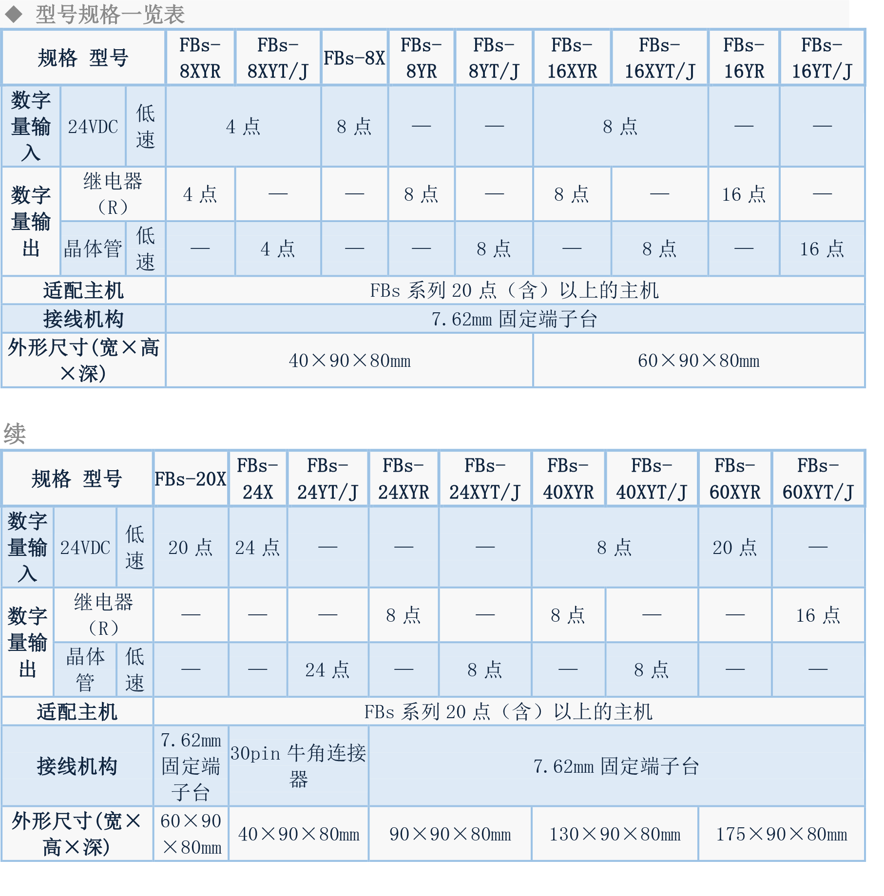 产品说明:8/16/20/24/40/60点开关量扩展模块适配FBs系列所有20点(含)以上的PLC主机.