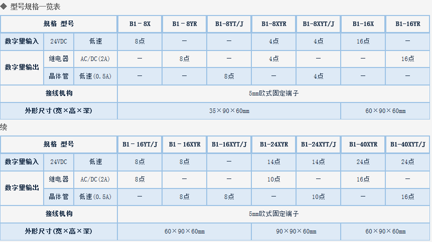 B1数字量扩展模块产品说明:8/16/20/24/40点开关量扩展模块 适配B1系列所有的PLC主机.