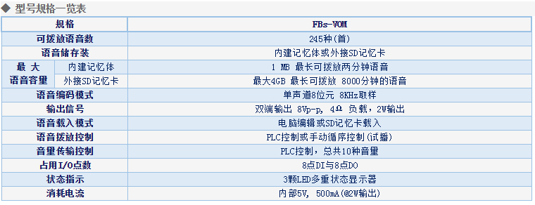 FBs-VOM 语音输出模块(Voice Output Module)是一个可由FBs-PLC操控的语音消息播放模块.其适用于具语音导引的应用中.例如机械式停车系统或电梯系统.本模块拨放的音源是采标准之波形档格式(.wav)因此可轻易的在计算机上完成录制或编辑的工作.配合本模块的应用此产品亦提供一语音文件管理软件.除可产生模块播放所需之音源档外还可方便使用者将收集之音源作一有系统之管理以方便重复应用.本模块在安装上十分方便可直接固定于DIN-Rail 上或采用螺丝固定。
