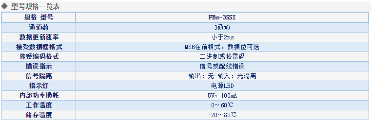 FBs-3SSI是FATEK FBs系列PLC中的一特殊功能扩充模块。可用来连接具同步串列界面(Synchronous Serial Interface)的绝对位置感测装置。本模块可将装置的感测位置以数位的方式读出。 同步串列界面信号采差动的方式驱动。应用时不易受到杂讯的干扰。