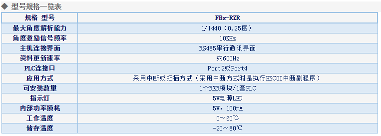 FBs-RZR模块是FBs PLC系列中的一个特殊应用模块。可用与链接解角器(Angular Resolver)感测元件。透过内部的角度信号处理晶片,此模块将转轴的角度信号转换为应用程式可以处理的数位信号。有别于一般的光学编码(encoder),耐震,防油,防尘,强固是解角器的最大优点,也因此特别使用于恶劣环境的应用场合,例如高震动性的冲床(press machine)是解角器最典型的应用。